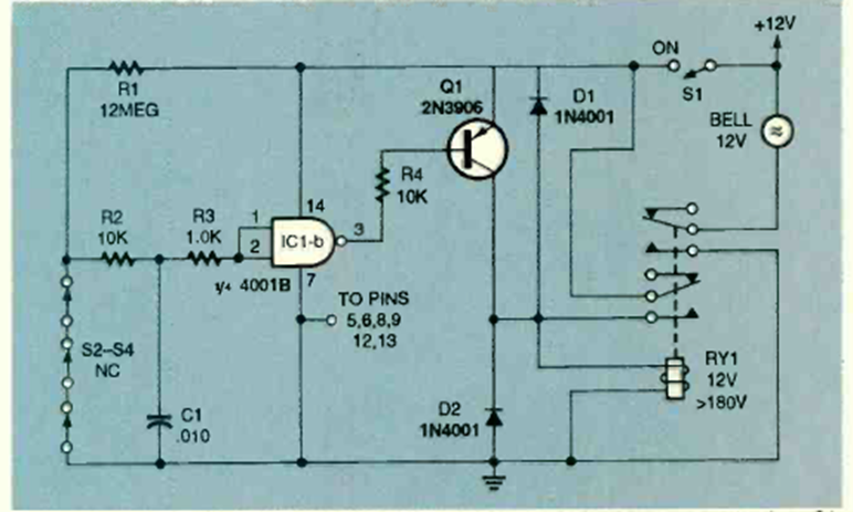 Este circuito de alarma con sensor en serie se encontró en la edición de junio de 1994 de la revista Electronics Now. El circuito se alimenta mediante el relé utilizado.