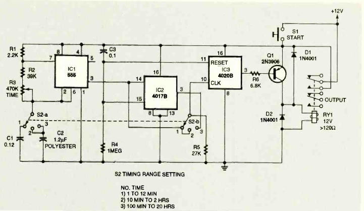 Este temporizador de amplio rango fue encontrado en la edición de julio de 1994 de la revista Electronics Now. El circuito acciona un relé y se alimenta de acuerdo con la tensión del relé.