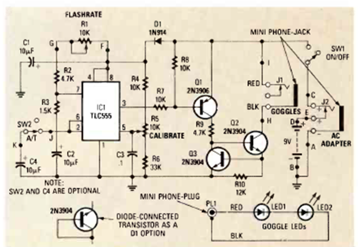 Este proyecto apareció en la edición de abril de 1989 de la revista Radio Electronics. Excita LEDs en gafas (algo poco recomendable) para relajarse. El circuito utiliza un 555 que alimenta los LED.