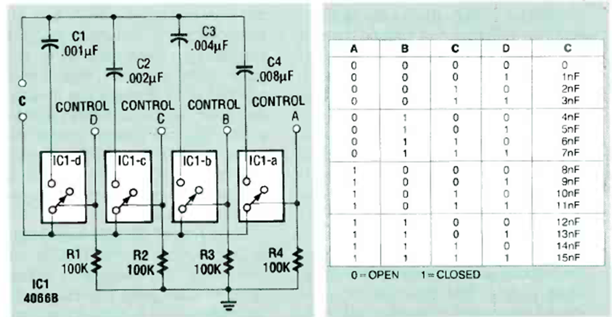 En la figura tenemos la forma de obtener una capacitancia de forma digital con 4066 interruptores. La tabla muestra las capacitancias obtenidas según los comandos digitales. El circuito es de una Radio Electronics de noviembre de 1989.