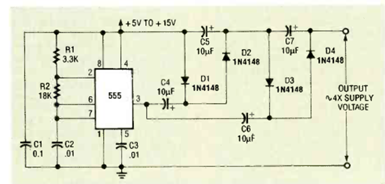 Este circuito fue encontrado en la revista Radio Electronics de diciembre de 1992. La corriente es de unos pocos mA y la tensión de entrada máxima es de alrededor de 12 V.