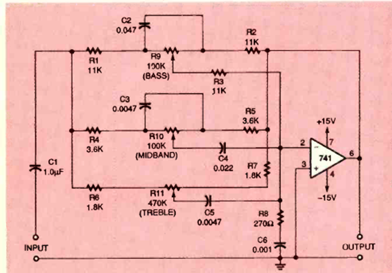 Este control para graves, medios y agudos se encontró en la edición de marzo de 1995 de la revista Elecronics Now. El circuito requiere una fuente de alimentación simétrica.