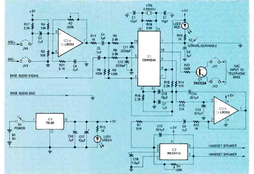 Este codificador de voz se publicó en la edición de agosto de 1982 de la revista Radio Electronics. El circuito es para líneas telefónicas analógicas antiguas.