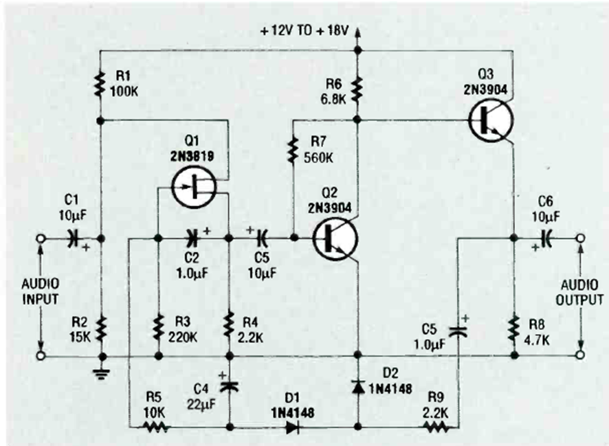 En este circuito se utiliza un JFET para mantener una ganancia constante. El circuito es de Electronics Now de abril de 1993. El circuito puede utilizar cualquier JFET y los demás transistores son de propósito general.