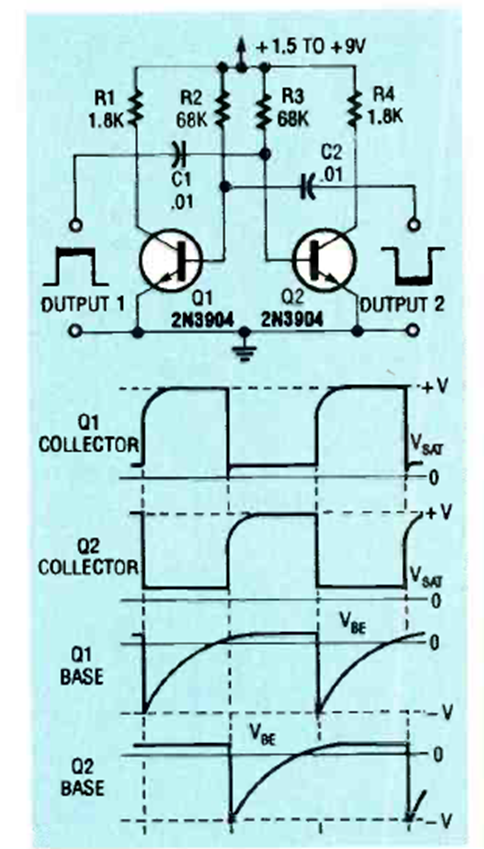 Este circuito, que utiliza transistores de propósito general 2N2904, proviene de la revista Electronics Now de diciembre de 1993. Los capacitores determinan la frecuencia.