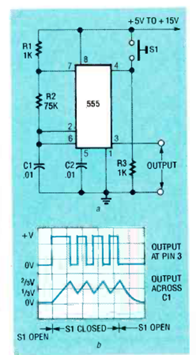Encontramos este circuito en la revista Radio Electronics de octubre de 1992. La frecuencia viene dada por C1, cuyo valor puede modificarse. Observe las formas de onda de la señal generada.