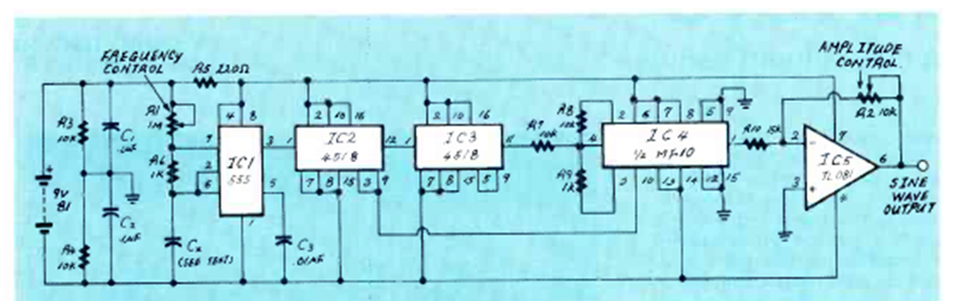 Este circuito genera señales sinusoidales que dependen del oscilador de entrada. El circuito es de una Radio Elecrtronics de abril de 1988. Las señales están en el rango de unos pocos cientos de kilohertz.