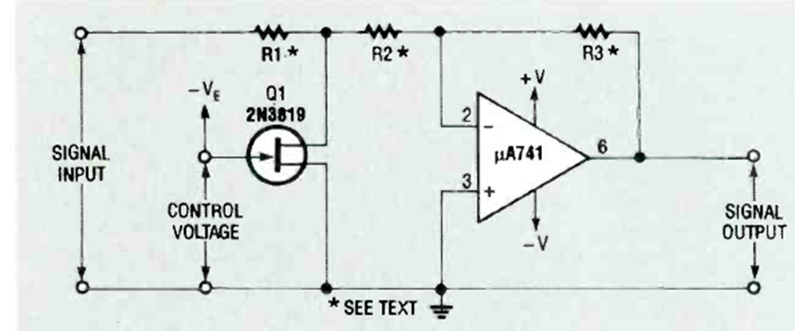 Este circuito se encontró en la edición de abril de 1993 de la revista Electronics Now. Con él, es posible controlar la ganancia de un circuito operacional con un JFET.