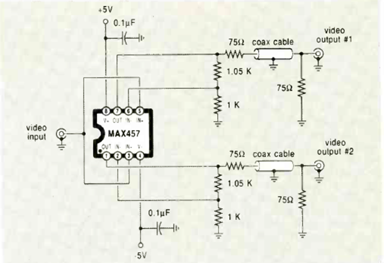 Este circuito para señales de vídeo analógicas se encontró en la edición de agosto de 1970 de la revista Radio Electronics. El circuito se utiliza para controlar dos entradas de vídeo a partir de una señal.