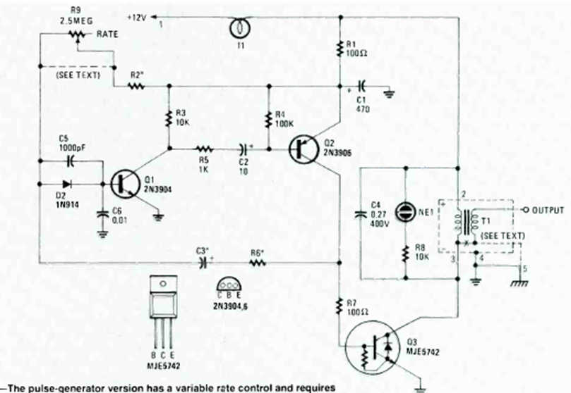 Encontrado en la edición especial de 1990 de la revista Radio Electronics Experimenter, este circuito utiliza una bobina de encendido de automóvil. Se pueden realizar ajustes según la bobina.