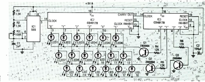 Este interesante circuito de 18 LED multiplexados fue encontrado en la revista Radio Electronics de febrero de 1992. El circuito tiene su velocidad controlada por R3. Los LED forman barras móviles de 6 LED.