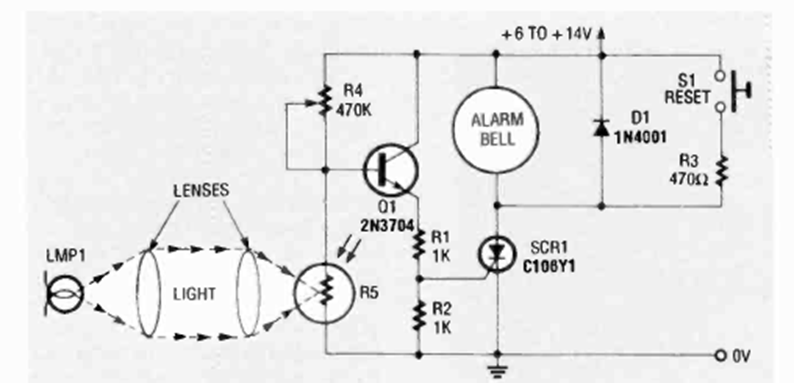 Encontramos este circuito en la revista Radio Electronics de julio de 1992. Un sistema óptico produce el haz de luz que, al interrumpirse, activa la alarma. La sensibilidad se ajusta en R4.