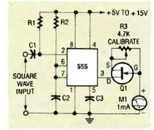 Este circuito de tacómetro automotriz utiliza un FET y un instrumento de escala completa de 1 mA. Lo encontramos en la revista Radio Electronics de diciembre de 1992.