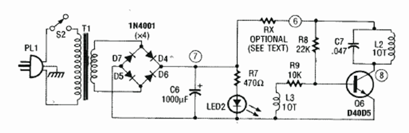 Este circuito es un cargador inductivo para el proyecto anterior, y eventualmente se puede adaptar para teléfonos celulares. El circuito es de un artículo del Electronics Experimenter Handbook de 1992. La corriente de carga es del orden de 100 a 125 mA.