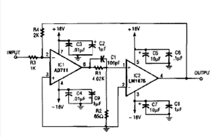 Encontrado en una Electronics Now de la década de 1990, este circuito utiliza un circuito integrado específico de la época que proporciona 10 W con una fuente simétrica de 18 V. El circuito integrado debe estar equipado con un disipador de calor.