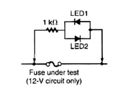 Encontramos este sencillo circuito de monitoreo de fusibles para automóviles en un William Sheets. El LED se enciende cuando se funde el fusible.