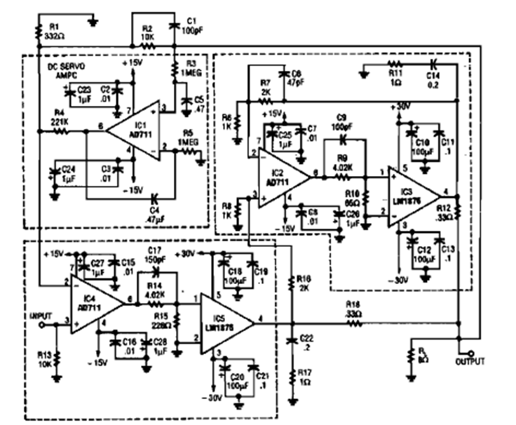 Este circuito es de una Electronics Now de los años 90. Utiliza un circuito integrado de potencia de la época que requiere un disipador de calor. La fuente de alimentación es de 18 V.