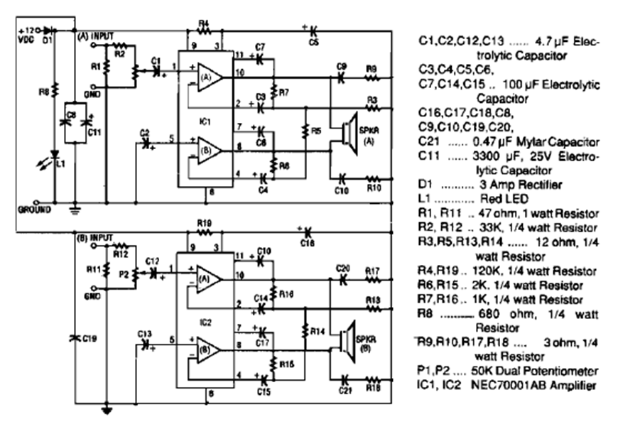 Este amplificador estéreo de 20 W por canal, que utiliza circuitos integrados NEC 70001 AB, se republicó en el PE-Hobbyist Handbook en una edición de la década de 1995. El circuito aparece en varias publicaciones. Esta es de 1995.