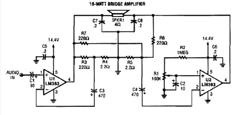 Este circuito, que utiliza el LM383, se encontró en una Popular Electronics de los años 90. La fuente debe ser de 14 V y los circuitos integrados deben tener buenos disipadores de calor.