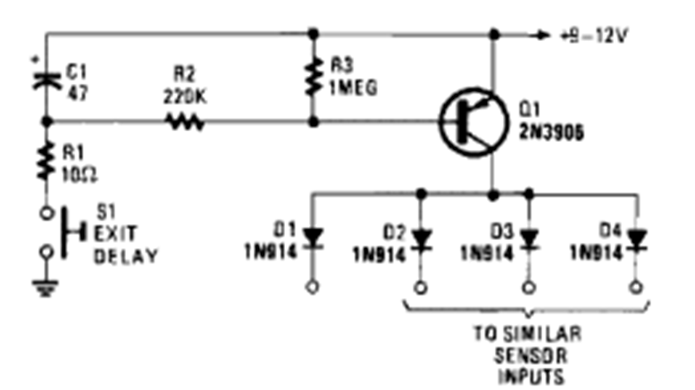 Este circuito proporciona un retardo en la activación de una alarma, lo que permite al propietario abandonar el establecimiento. El circuito proviene de la Enciclopedia de Circuitos Electrónicos de 1995, Volumen 5.