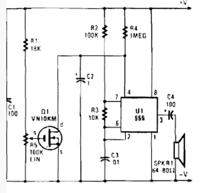 Este circuito, presente en una marca de electrónica popular de la década de 1990, monitorea el voltaje de una fuente de alimentación o batería. La tensión de disparo se ajusta con un potenciómetro.