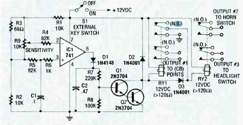 Encontrado en el Electronics Experimenter Handbook de 1991, este circuito detecta variaciones de voltaje en el circuito cuando arranca el motor.