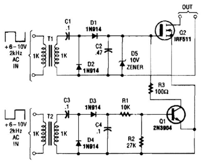 Este circuito conmuta cargas de potencia mediante señales de audio. El circuito es de una Popular Electronics de los años 90. Los componentes se pueden cambiar según la señal utilizada.