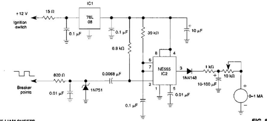 Este circuito de instrumento analógico se encontró en un William Sheets de la década de 1990. Los componentes son comunes y solo son compatibles con vehículos con interruptores mecánicos (circuit breaker).