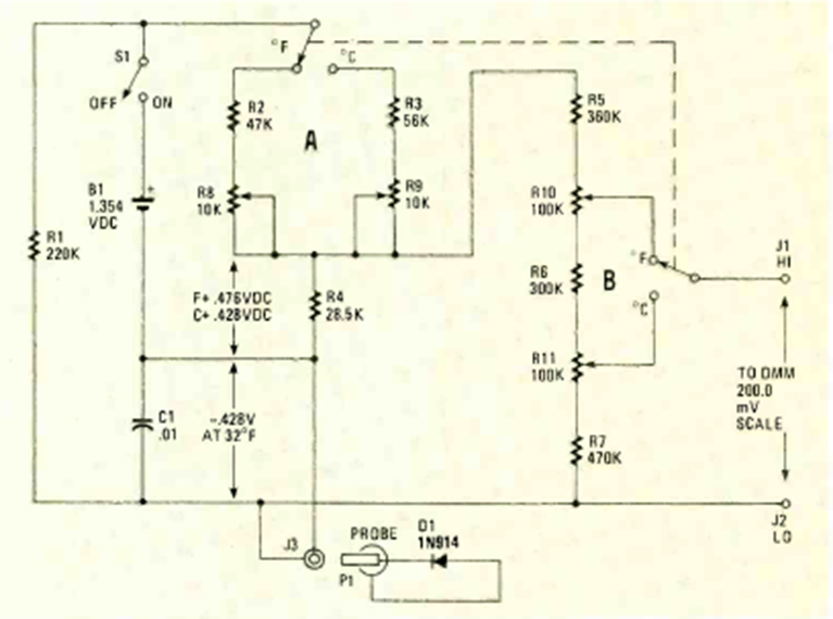 Este circuito se utiliza para detectar temperaturas en grados Celsius y Fahrenheit. El circuito proviene de Proyectos Especiales de 1983, publicado en la revista Radio Electronics.