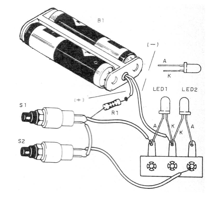 Es un simple indicador visual que se puede utilizar para enviar un mensaje en código, avisar si algo está disponible o no (verde, rojo). Basta con combinar previamente la codificación y luego usar el aparato. Se trata de un montaje muy simple, alimentado por pilas comunes que tendrán una excelente duración dado el bajo consumo. En la figura 1 tenemos el diagrama completo del aparato.