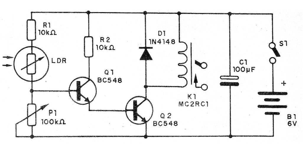 Con este aparato es posible controlar un relé desde el foco de luz de una linterna o incluso la luz ambiente, disparando una alarma o un sistema de advertencia. También es posible utilizar el aparato para conectar un ventilador cuando la luz está encendida. El circuito puede ser alimentado por pilas o fuentes dependiendo de la aplicación.