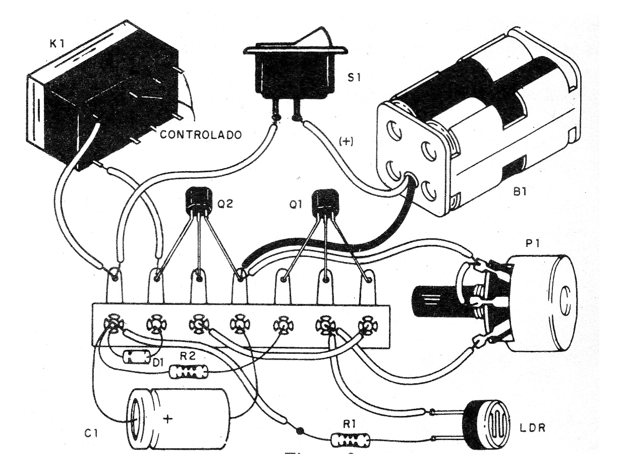 El circuito no tiene traba manteniéndose accionado solamente mientras haya incidencia de luz en el sensor. El montaje se puede realizar en la matriz de contactos, placa de circuito impreso o puente de terminales. La versión utilizando puente de terminales se muestra en la figura 2.