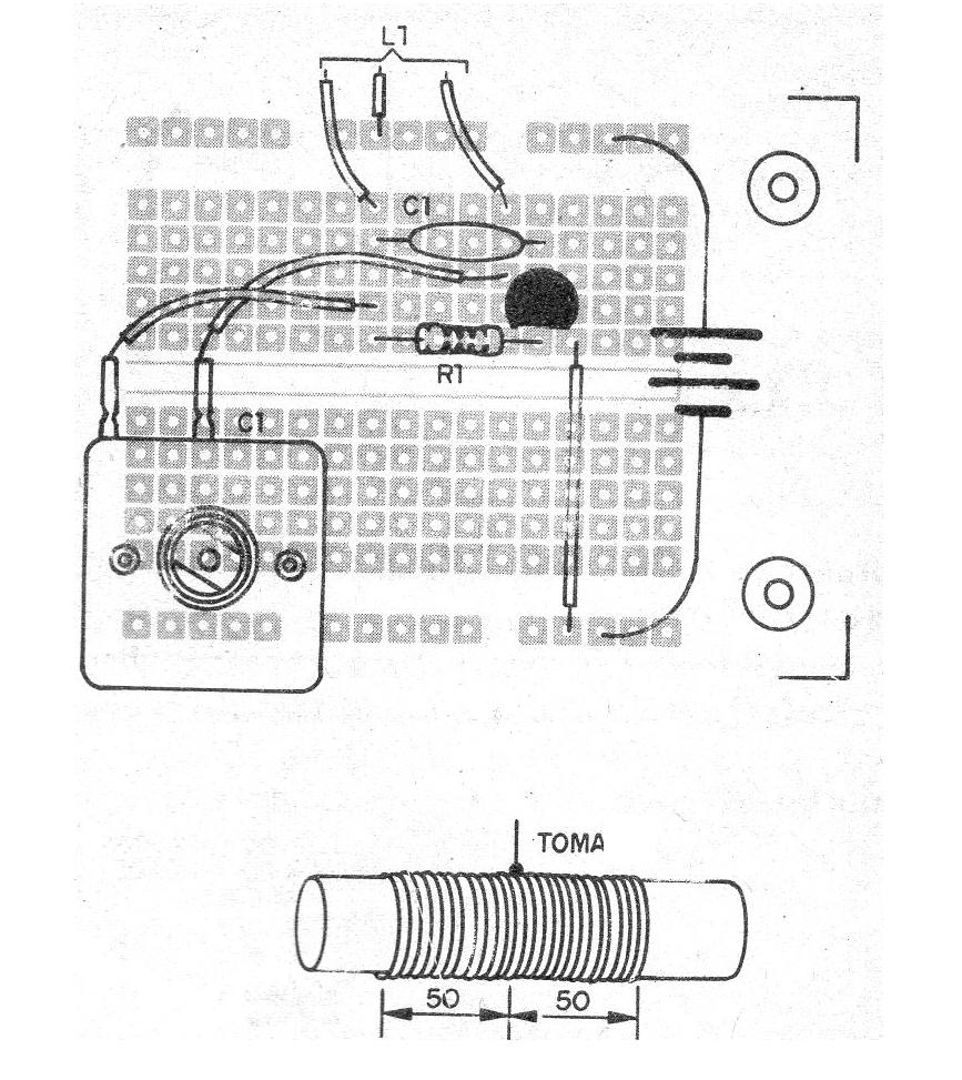 Se puede conectar una antena, formada por un pedazo de hilo de 1 m a 5 metros de longitud al colector del transistor.