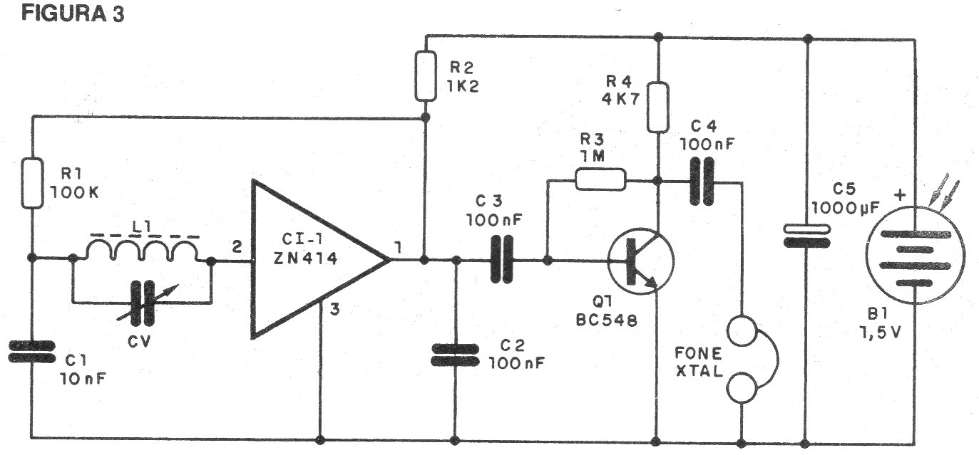 El ZN414 es un receptor completo que necesita muy pocos componentes externos para operar. Estos componentes básicamente son el circuito de sintonía formado por una bobina (L1) y una variable (CV), un resistor de polarización y un capacitor de desacoplamiento.
