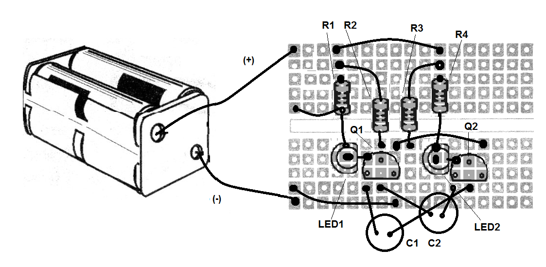 En nuestro caso, el cambio de estado hace que los LEDs controlados por los transistores queden encendidos y apagando de modo alterna.