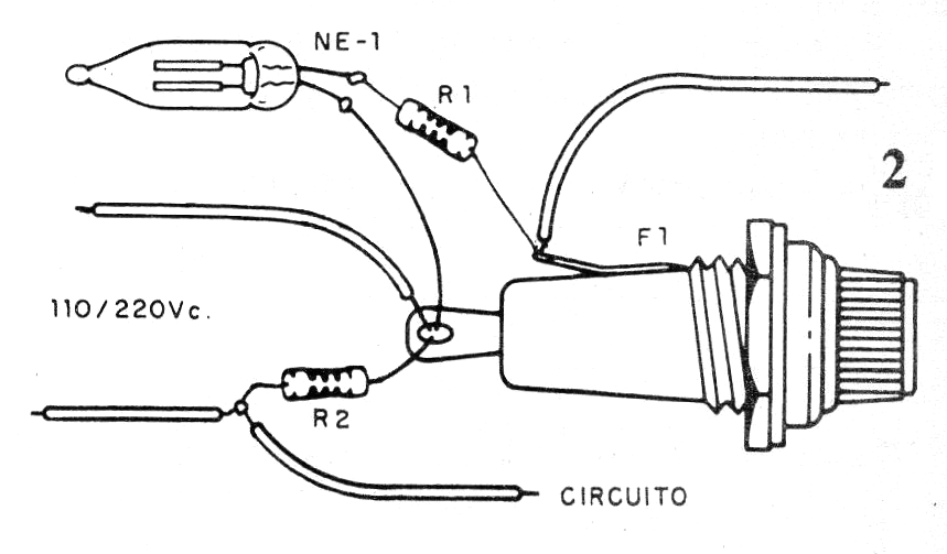 El circuito también se puede utilizar con otros tipos de fusibles y hasta disyuntores. En la figura 2 tenemos las conexiones reales que deben ser hechas con cuidado. Las resistencias usadas son de 1/8 W.