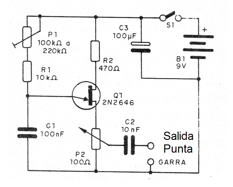 Este inyector de señales consiste en un oscilador de relajación con transistores unijuntura. El circuito tiene control de frecuencia y también para la intensidad de la señal.