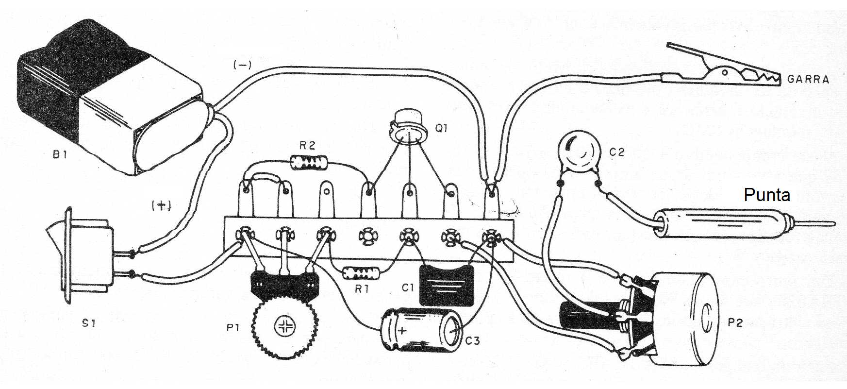 El transistor debe ser el 2N2646 y los potenciómetros tanto pueden ser lineales como logarítmicos. Los resistores son de 1/8 W o ¼ W y los capacitores comunes. Para las salidas sugerimos la utilización de la garra jacaré y una punta de prueba.