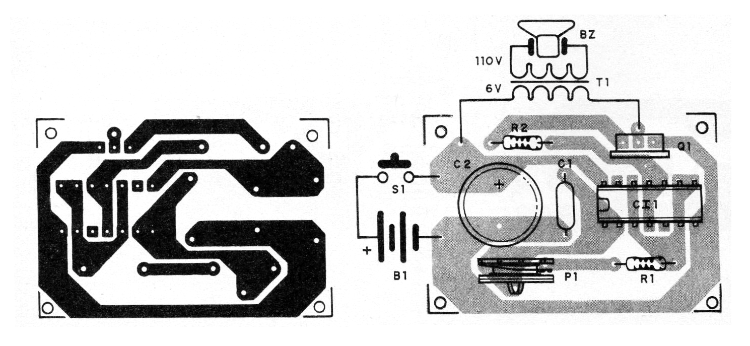 El transformador es del tipo utilizado en pequeñas fuentes de alimentación con primario de 110 V y secundario de 4,5 a 9 V con corriente entre 50 y 250 mA. También se puede utilizar un tweeter piezoeléctrico directamente conectado al colector de Q1.