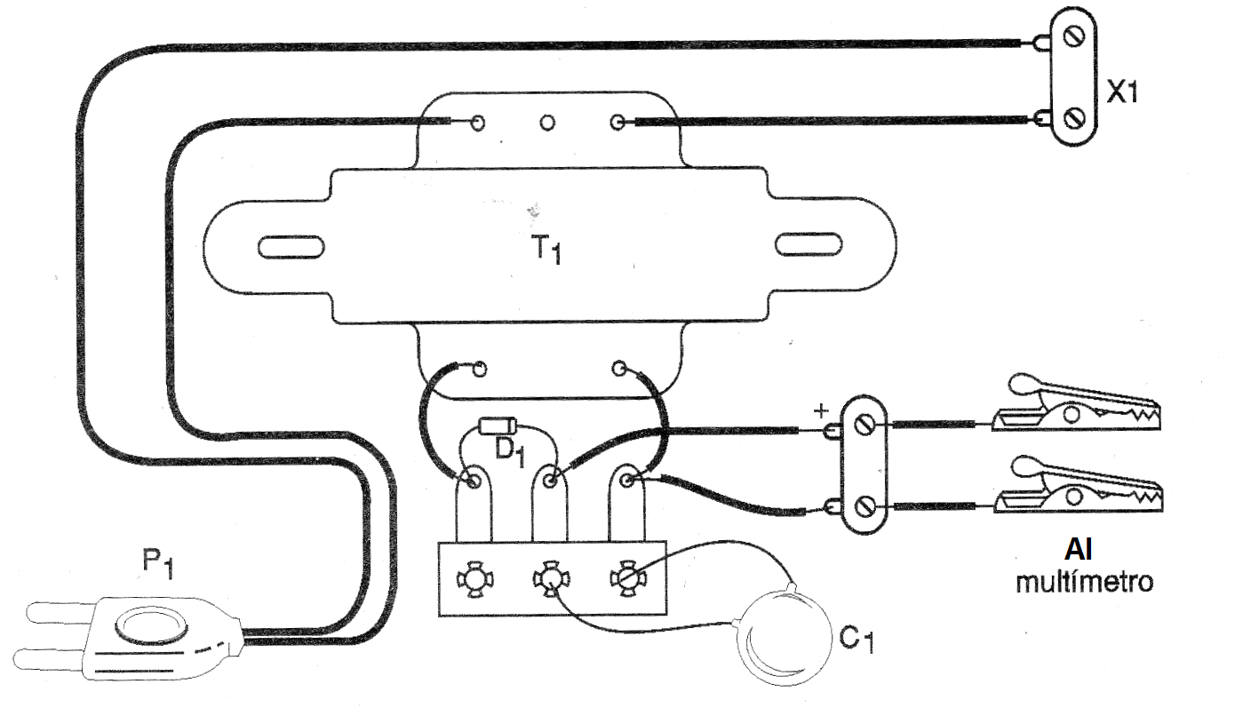 Observamos que el devanado primario estará conectado directamente a la red de energía, debiendo tomarse las precauciones adecuadas contra golpes. El voltímetro se utiliza en una escala de tensión continua alta, obtenida después de las pruebas de calibración.