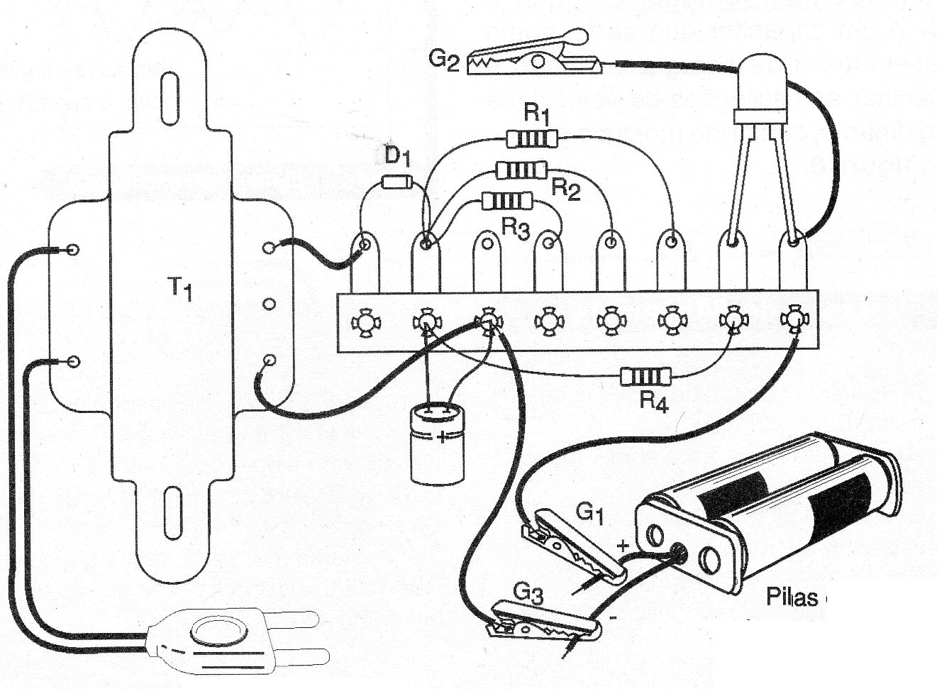 El circuito consiste en una fuente simple de baja corriente en la que deben conectarse las pilas. Este circuito se muestra en la figura 1.