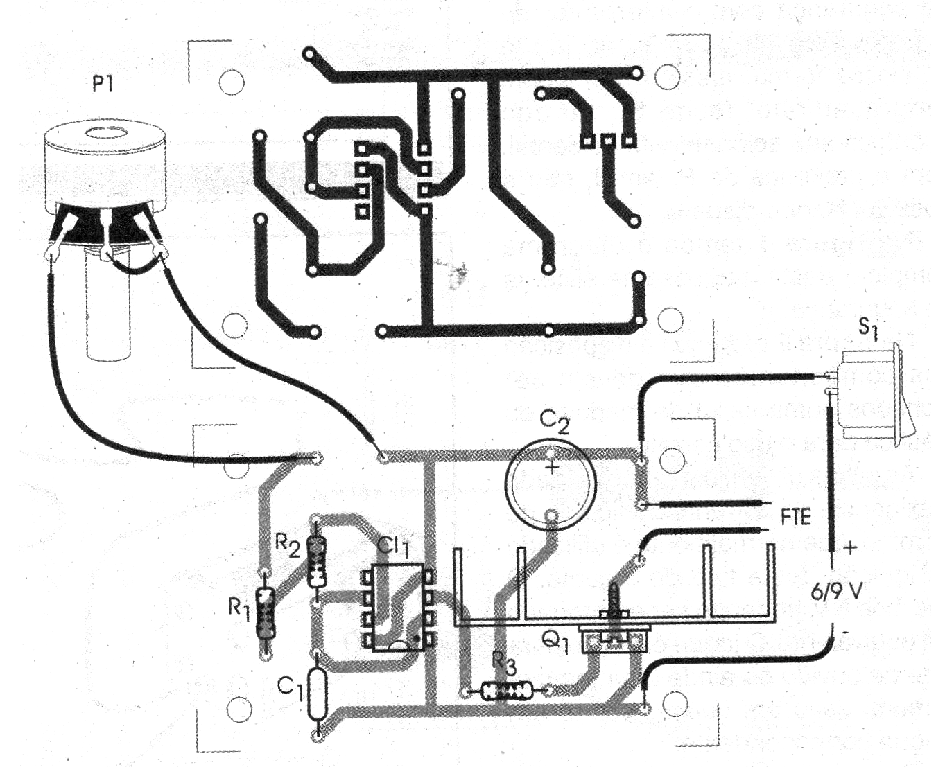 Se sugiere que el circuito integrado sea instalado en un zócalo y que el transistor tenga un pequeño radiador de calor. Este radiador no es más que una simple plancha de metal de unos 2 x 3 cm atornillada en el cuerpo del componente, aprovechándose el agujero existente para este propósito.