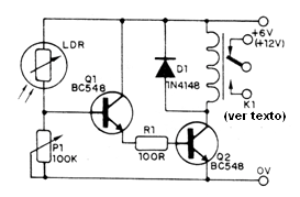 El circuito funciona tanto con relés de 6 V como 12 V y el sensor es un LDR común. El ajuste de sensibilidad se realiza a través de un trimpot o de un potenciómetro.