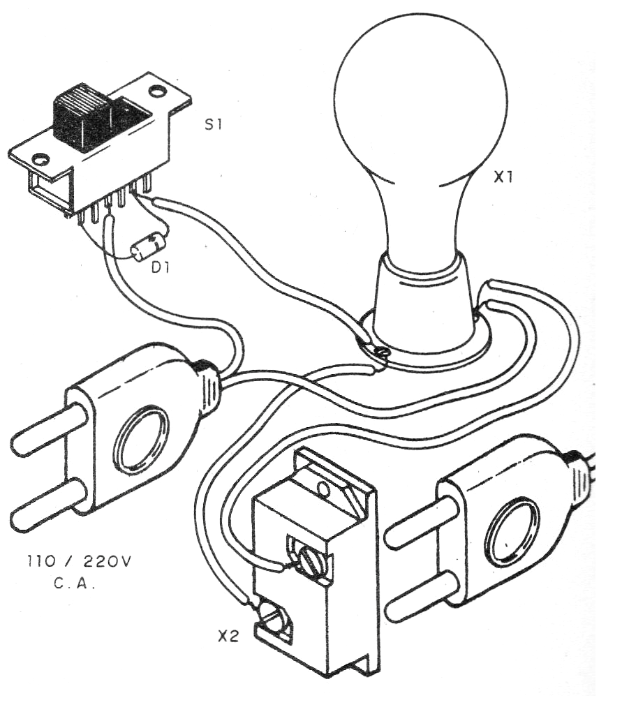 Si la red es de 110 V podremos usar el 1N4004 o 1N4007, pero en la red de 220 V debemos usar el 1N4007. La lámpara es incandescente pequeña, hasta 5 W, por ejemplo.