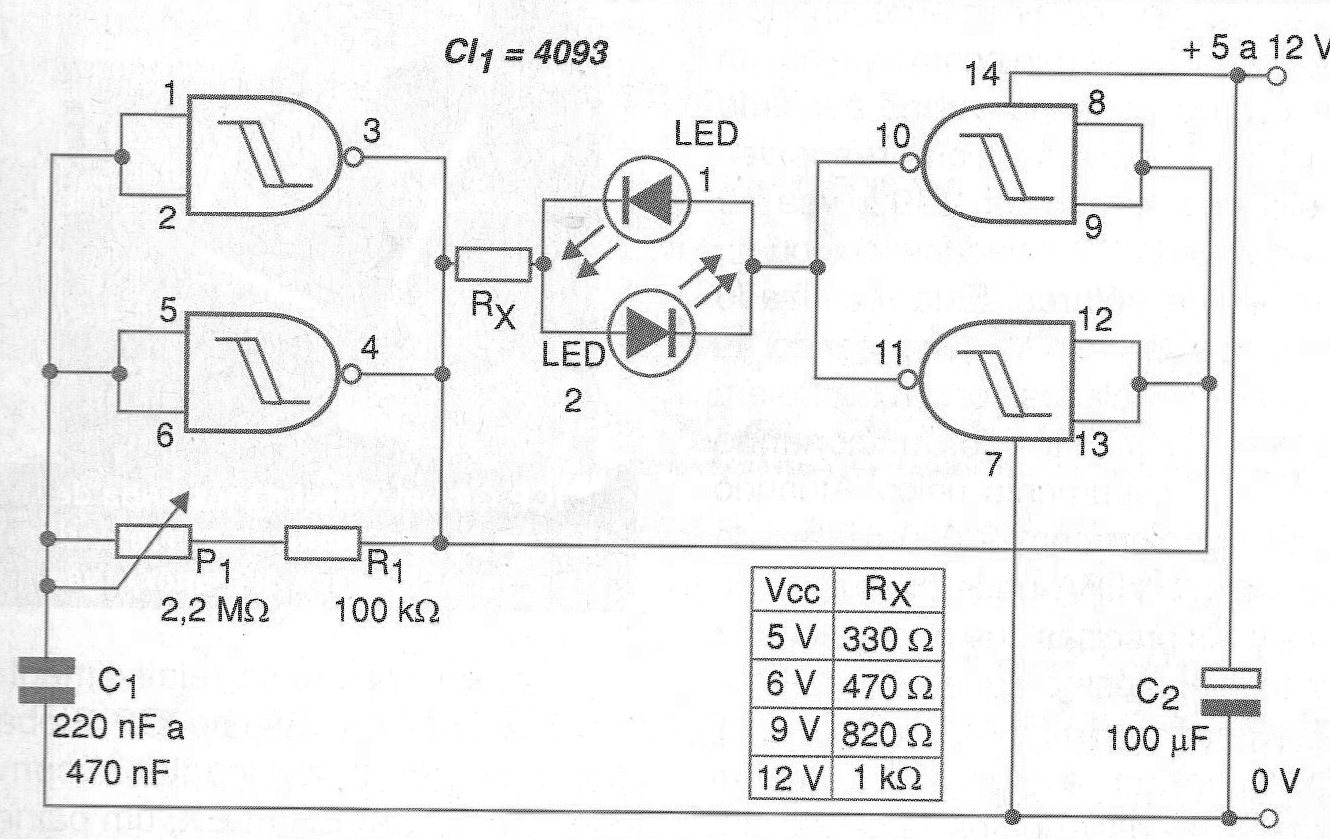 El circuito que mostramos en la figura 1 ofrece una solución rápida y sencilla para hacer dos LED (de colores diferentes o no) parpadeando alternativamente a una frecuencia que se puede ajustar en una amplia gama de valores.
