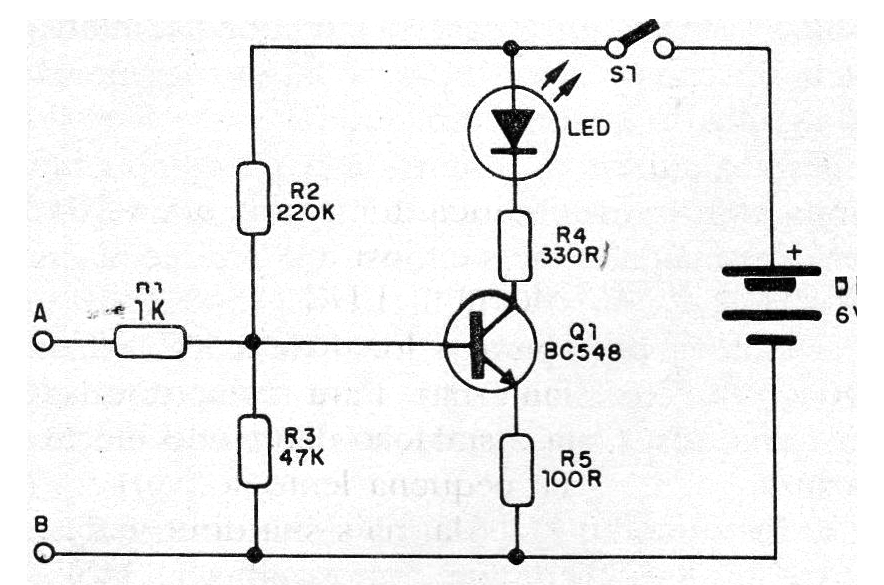 El LED puede ser de cualquier color y en su montaje debe observarse su polaridad. Los cables A y B se conectan a la salida de auriculares o al altavoz del equipo. En la figura 1 tenemos el diagrama completo del aparato.