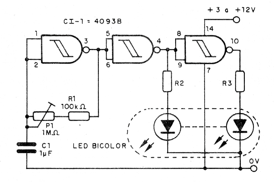 Este circuito hace un LED bicolor o dos LEDs de colores diferentes parpadean alternativamente, a una velocidad que se ajusta en el trimpot o potenciómetro P1. R2 y R3 determinan la intensidad de los intermitentes, pudiendo tener valores entre 220 ohmios a 3 V hasta 1,5 k para 15 V de alimentación.
