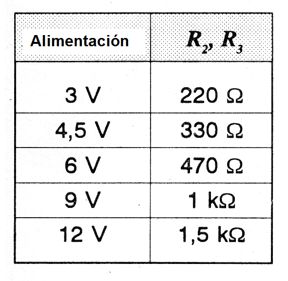 R2 y R3 dependen de la alimentación, según la tabla abajo.