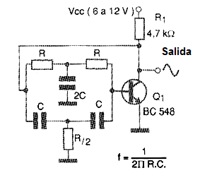 La fórmula que permite calcular la frecuencia en función de los componentes de la doble T también se da junto al diagrama, para facilitar el desarrollador.
