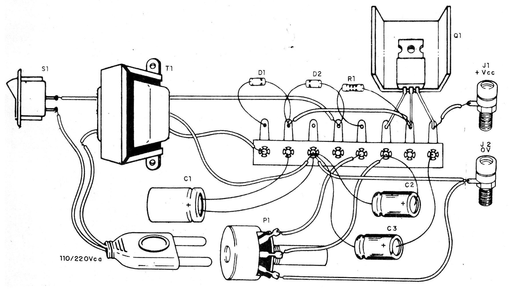 El circuito utiliza pocos componentes y el transistor de potencia debe estar dotado de radiador de calor. El transformador tiene un secundario de 12 + 12 V con 1 A. La fuente no tiene protección contra cortocircuitos en la salida. El diagrama completo de la fuente se muestra en la figura 1.
